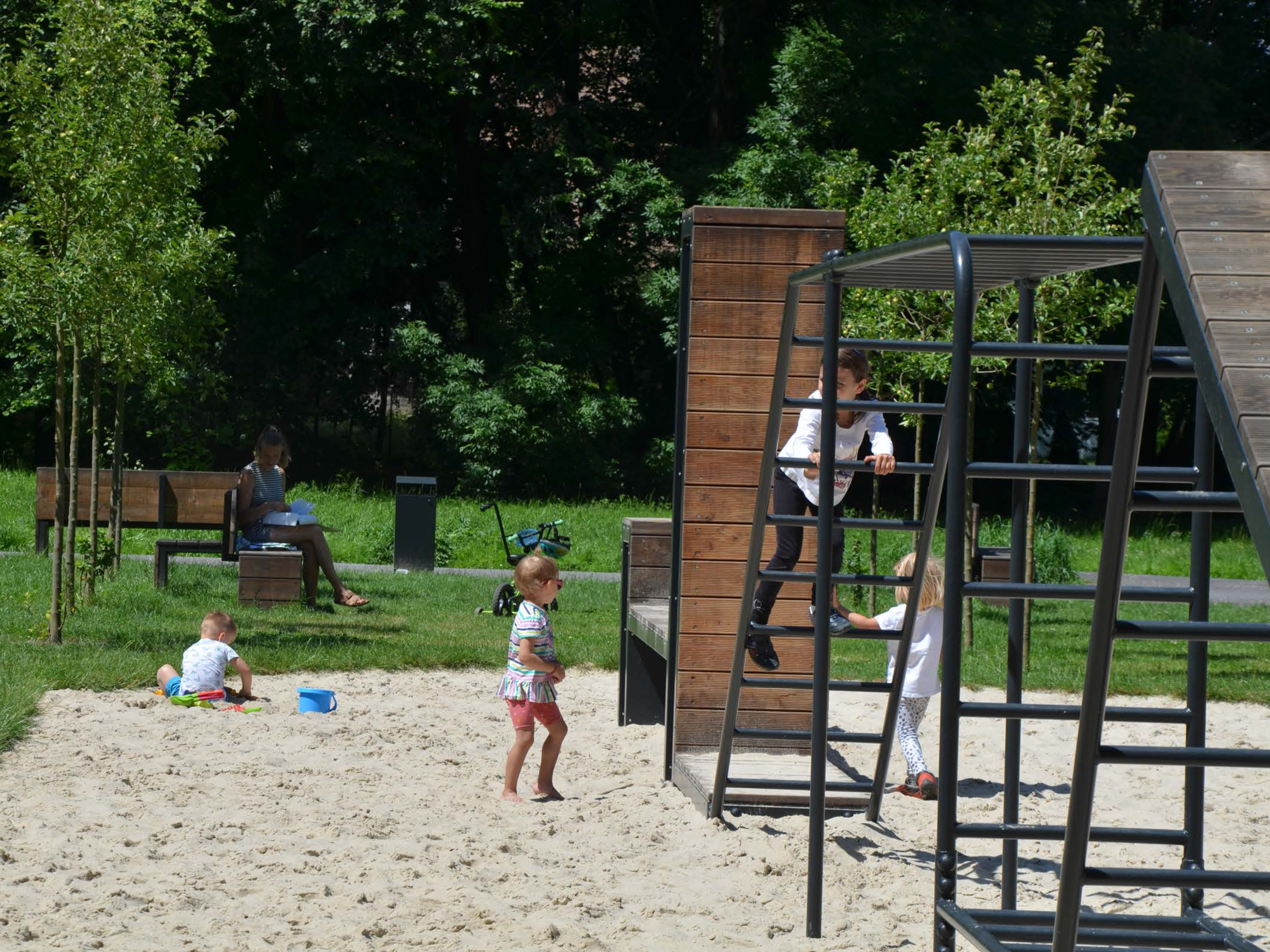 Nadrzędną troską przy tworzeniu projektu było zachowanie równowagi pomiędzy zastanym charakterem parku i planowaną weń ingerencją. Pomyślana więc ona została w taki sposób, by mogła łatwo wniknąć w krajobraz parku, dać się wchłonąć organiczności tego miejsca i stworzyć harmonijną relację pomiędzy naturą, decyzjami niegdysiejszych twórców parku a proponowanymi urządzeniami przyszłego placu zabaw. Dlatego projektowana aranżacja wykorzystuje istniejące już elementy parku, jak piaskownica, ścieżki, enklawy drzew i krzewów, łącząc się organicznie z zastanym krajobrazem, a nierzadko niknąc w nim całkowicie. Sprzyja temu także przemyślana i niewysycona kolorystyka urządzeń, stosowana dyskretnie i z umiarem. Plac zabaw będzie więc niemal ukryty w parkowych nasadzeniach, sprawiając wrażenie, jakby istniał tam od zawsze i był jego integralną częścią. Dzięki tym zabiegom aranżacja w zrównoważony sposób sąsiadować będzie z naturą, gdzieniegdzie manifestując tylko swoją obecność, a to z kolei stanowić będzie znakomite, nacechowane ekskluzywnością, zaproszenie do skorzystania z placu zabaw.